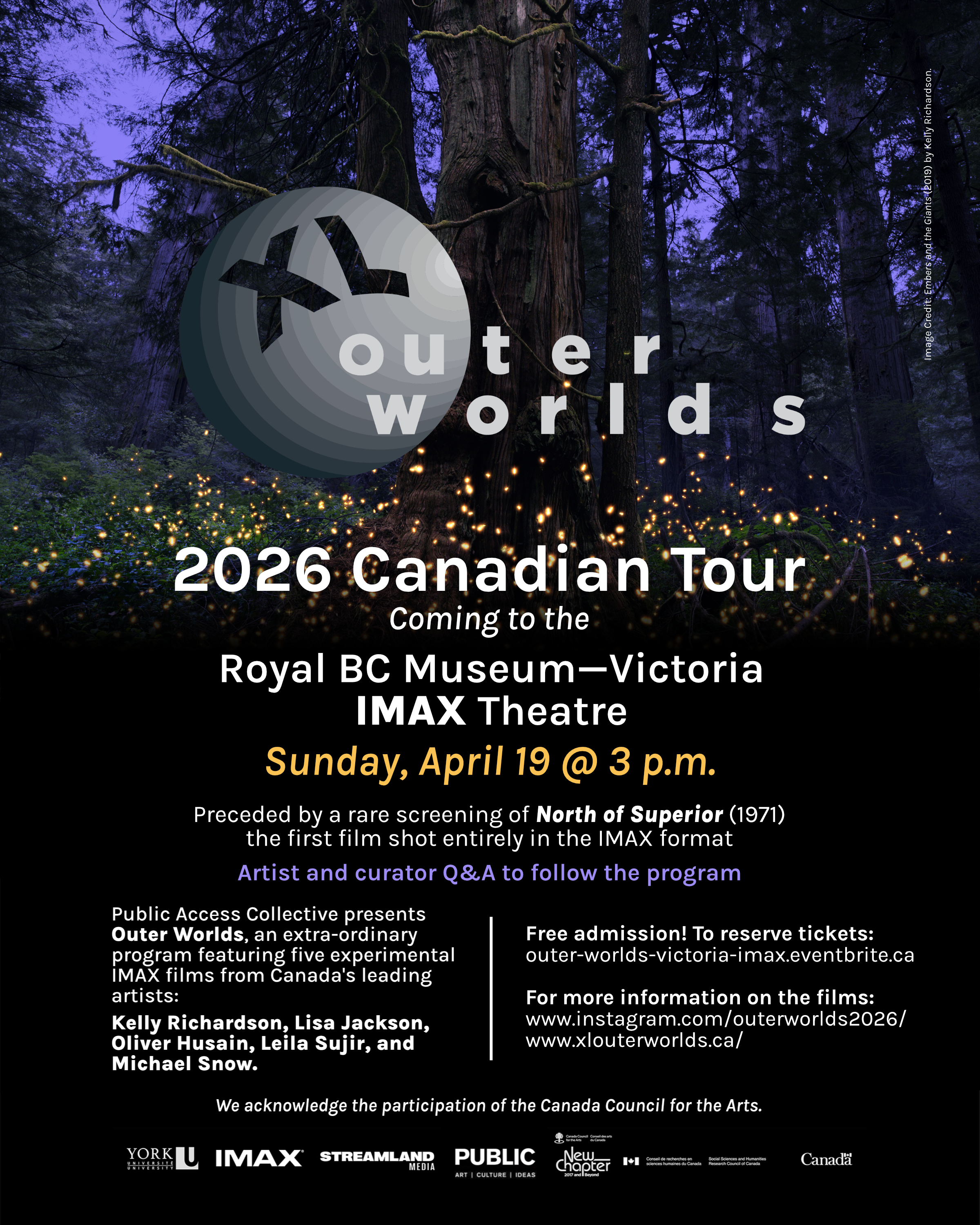 As part of an ongoing Canadian tour supported by the Canada Council for the Arts, Outer Worlds will screen in Victoria at the Royal BC Museum IMAX Theatre, accompanied by a restoration of Graeme Ferguson’s landmark IMAX film North of Superior (1971). Curator and artists will be in attendance for a Q&A.